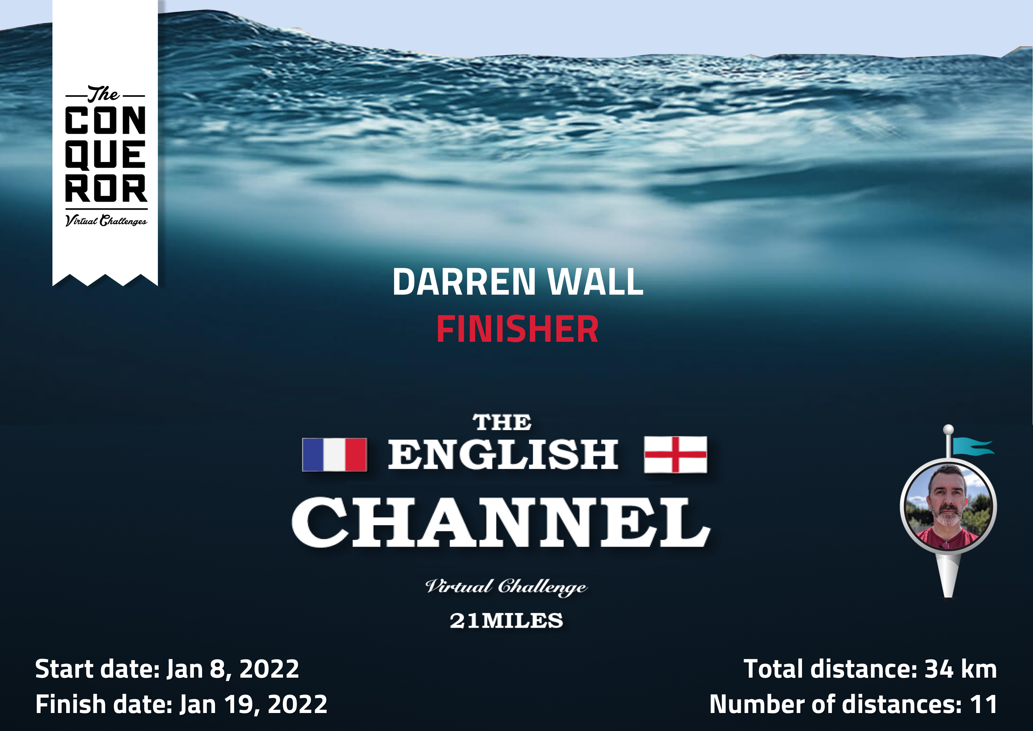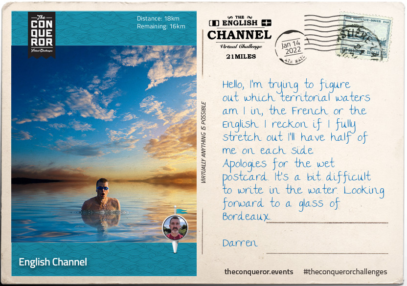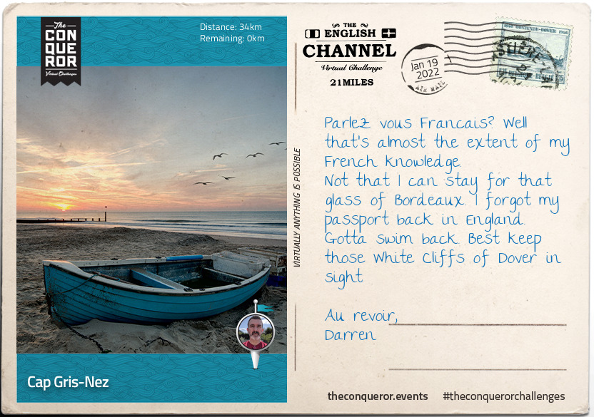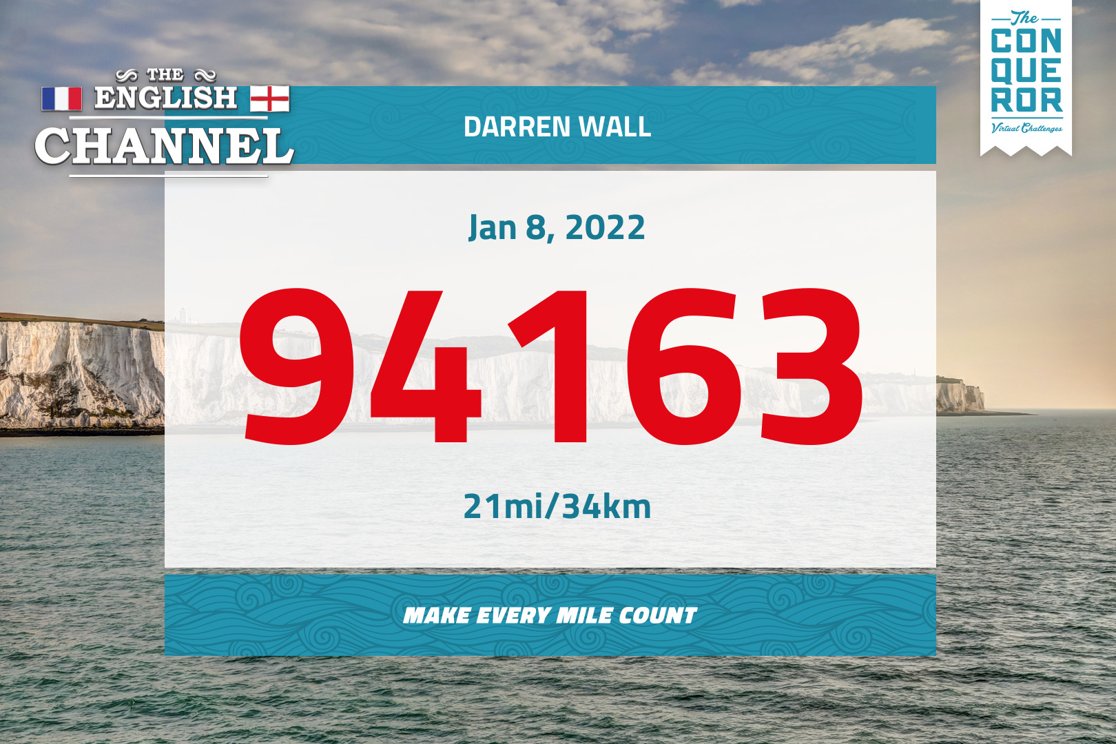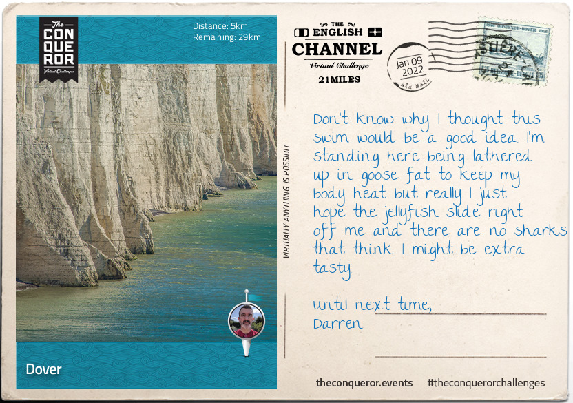 Today I completed my first "The Conquerors" challenge, "The English Channel". 21 miles over 11 days.