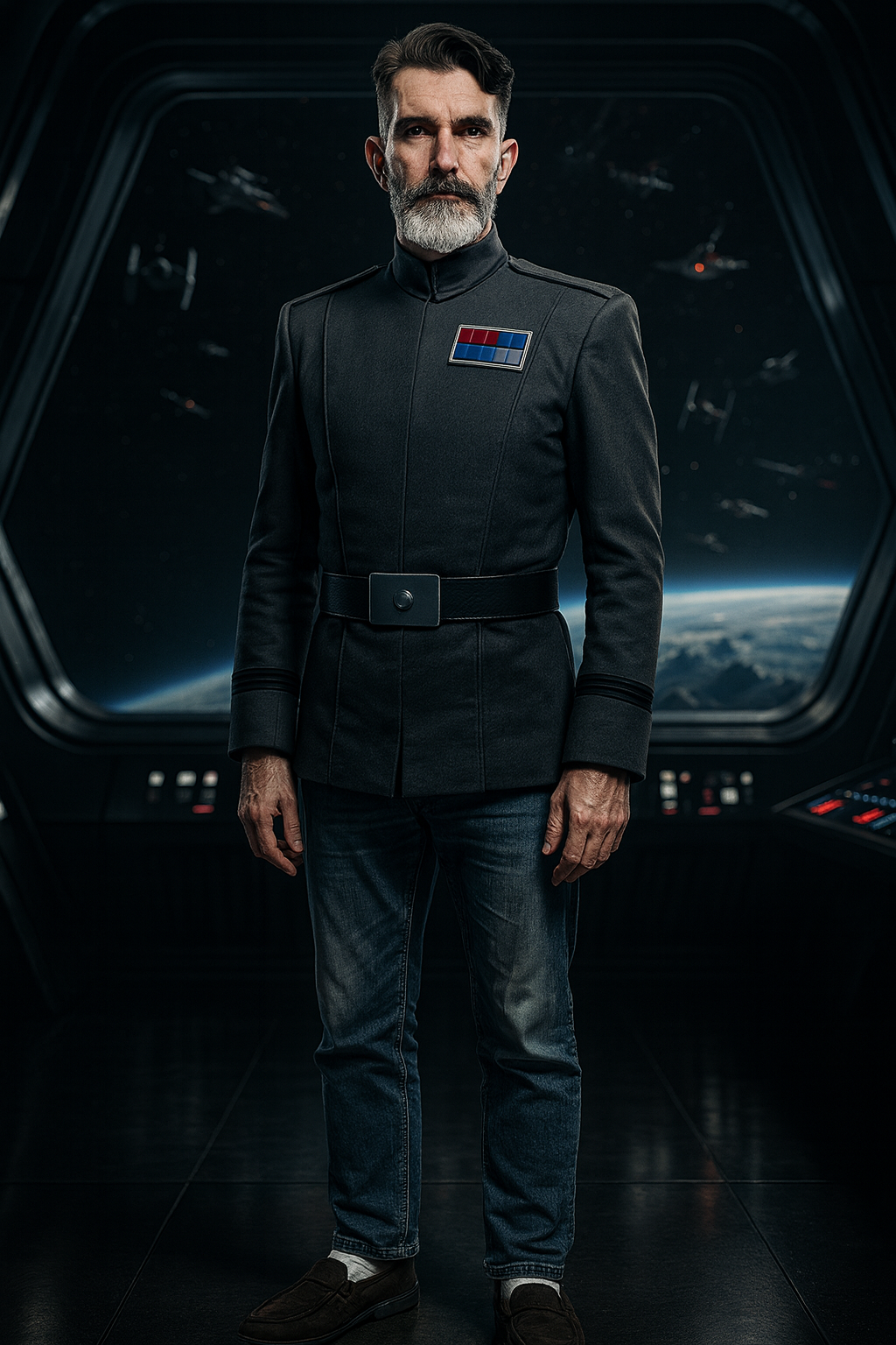 Prompt: A hyper detailed cinematic scene featuring the uploaded man 100% as reference as the cold, stern imperial admiral of an enormous scale planet destroying space craft. The camera captures the full length of shot of the admiral with sharp, crips, bold uniform, however below the waist he is wearing jeans and slippers, he wears a rectangular broach made of red and blue squares that signify his rank. The background is the dark grey, high gloss battle bridge of the spacecraft. Behind the admiral are large windows looking out into space, a space battle can be seen taking place in the distance though not filling the entire window, across the bottom of the window is the unmistakable horizon of a close by planet. Intense, dramatic science fiction poster style, ultra-realistic textures, detailed reflections, high contrast, 8K resolution, deep shadows, powerful atmosphere.